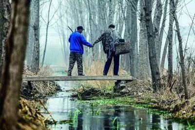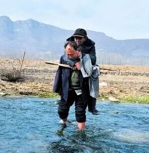 Haixia rolls up Wenqui’s pants as they prepare to cross the river, and Wenqui carries Haixia on his back.